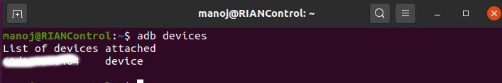adb devices - This should display your device as detected on the screen. It will show up as an alphanumeric number followed by ‘device’ on your console. Check screenshot below