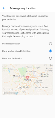 In Advanced Privacy, Fake my location takes advantage of existing low-level operating system features that we have connected to the Advanced Privacy User Interface to make it easy to use and hidden from applications. Fake my location bypasses the real location provided by the satellite radio navigation system or the network, and instead sends the one set by users to applications that are requiring location.