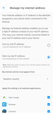 The user can choose to provide their true IP to a defined list of apps. To do so they just need to enter the Real IP address entry on Advanced Privacy’s homepage and untick the apps to which the real IP address can be provided.