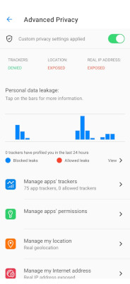 The user can choose to provide their true location to a defined list of apps (for instance their navigation app or their weather app). To do so they just need to enter the Geolocation entry on Advanced Privacy’s homepage and untick the apps to which the real location can be provided.