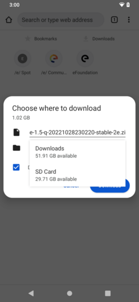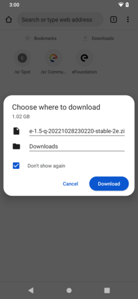 In the URL bar, enter https://lstu.fr/2e15q the shortened URL or https://ota.ecloud.global/builds/full/stable/2e/e-1.5-q-20221028230220-stable-2e.zip the full URL.