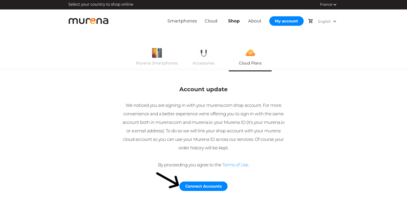 After you’ve logged in, visit Murena Shop subscriptions page. You will be prompted to link your Murena Workspace and Murena Shop accounts. To authorize this change, you must enter your Murena Workspace password.