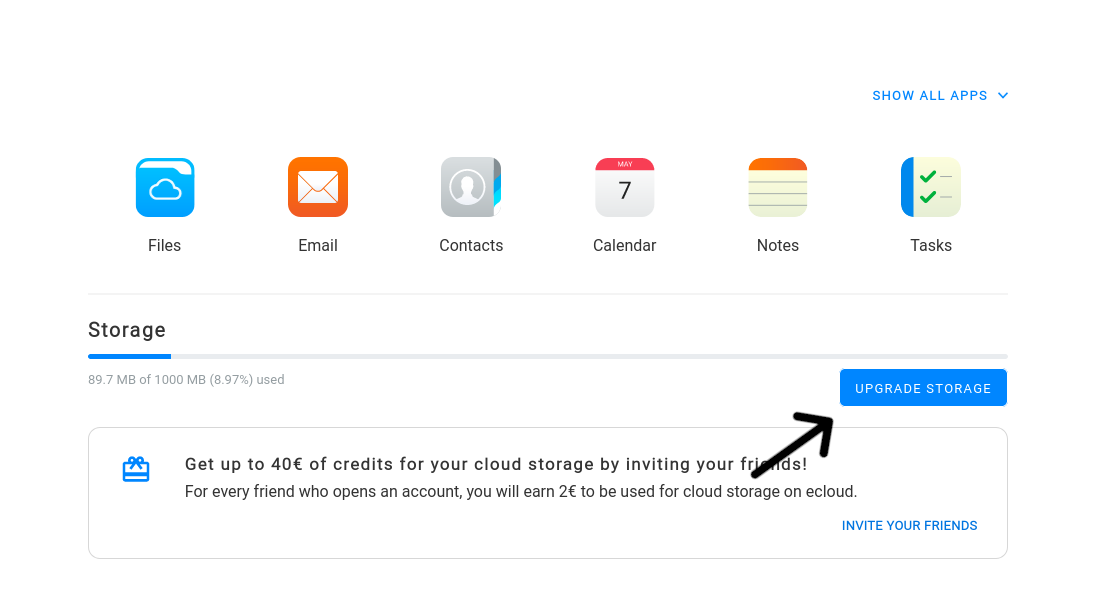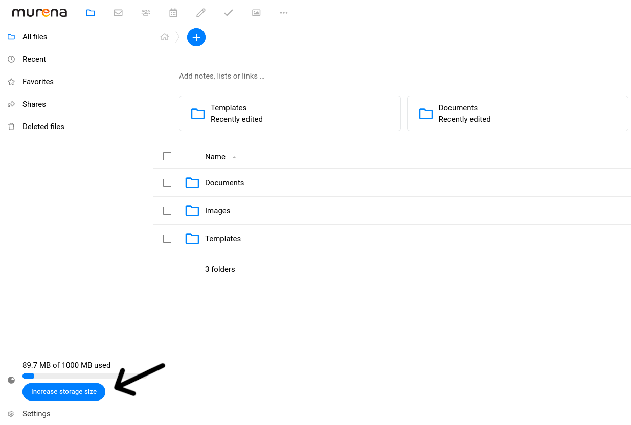 You can either click UPGRADE STORAGE on your Dashboard or click Increase storage size in the Murena Workspace files app. Both options will redirect you to the subscriptions page.